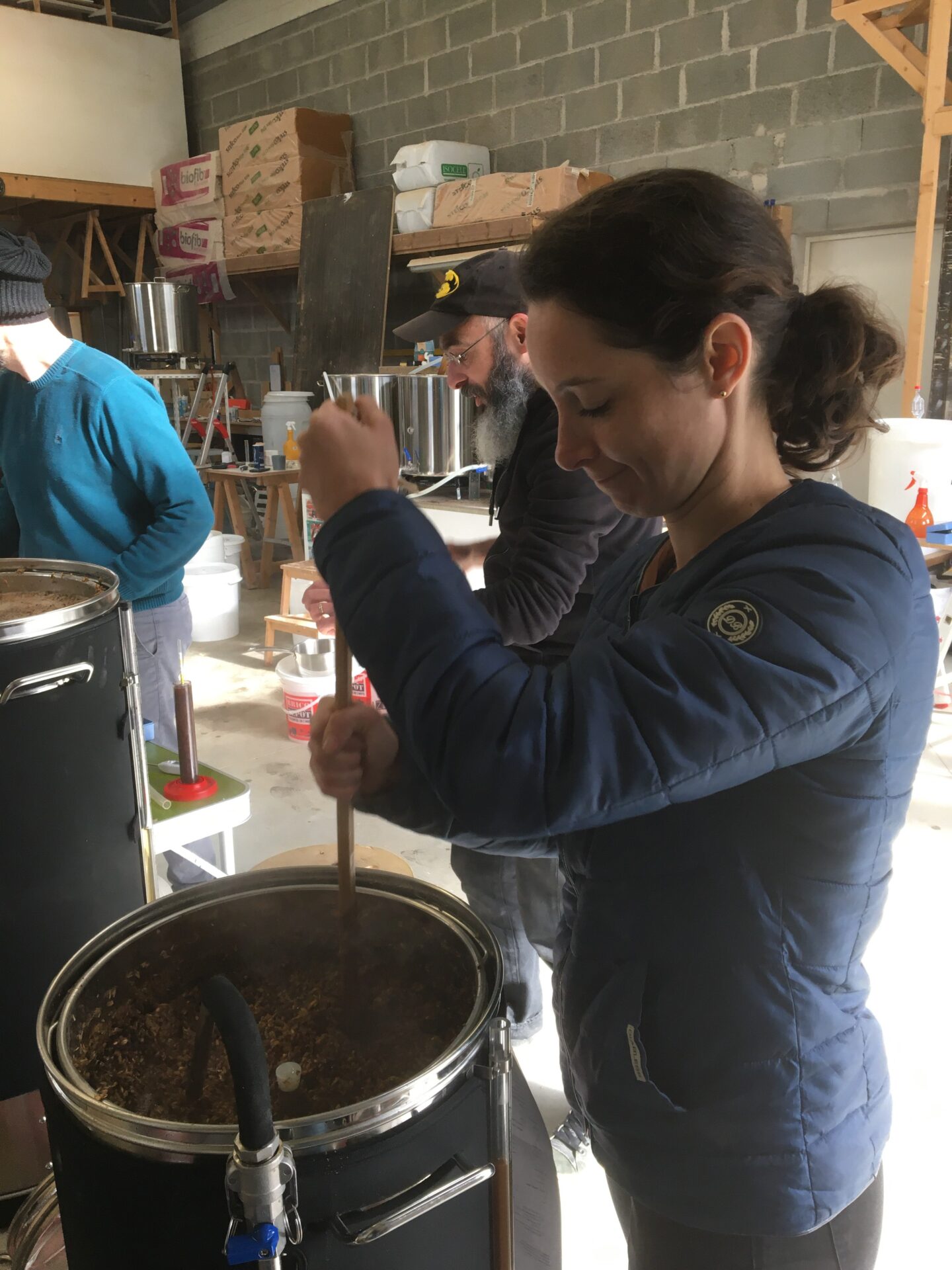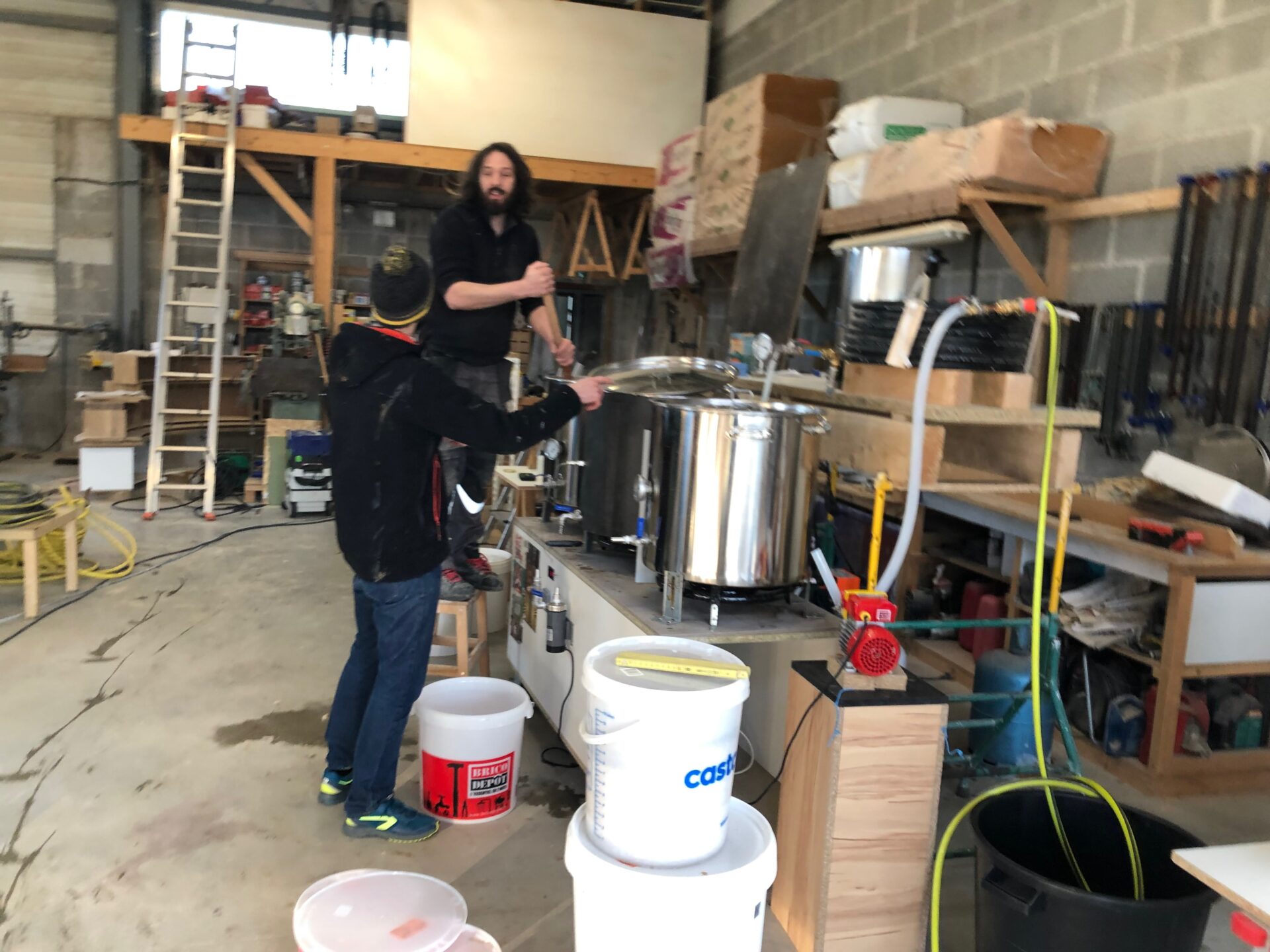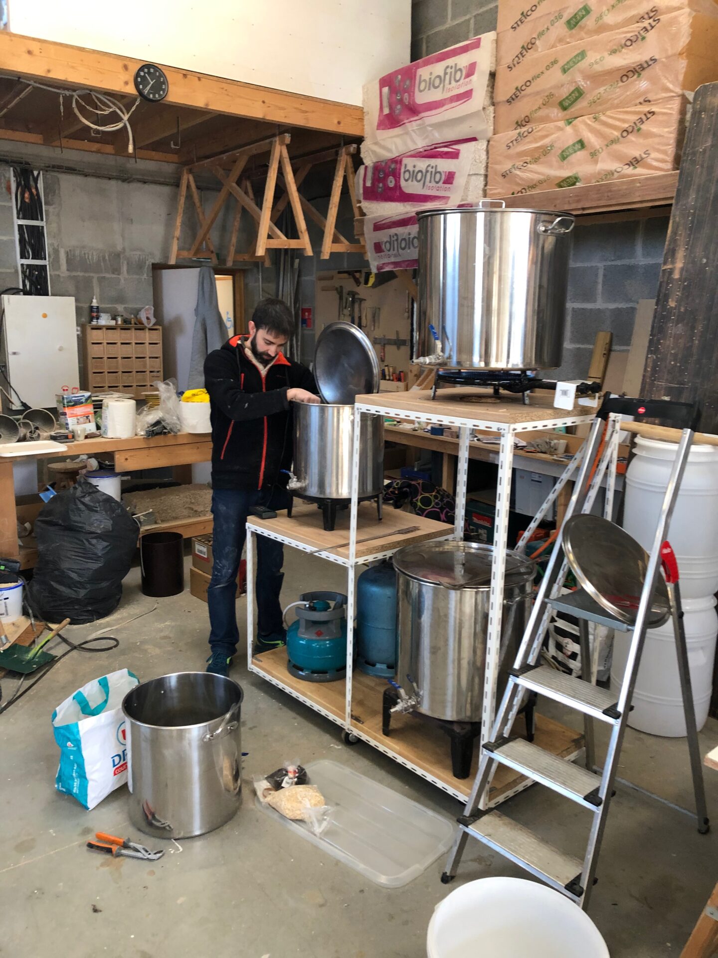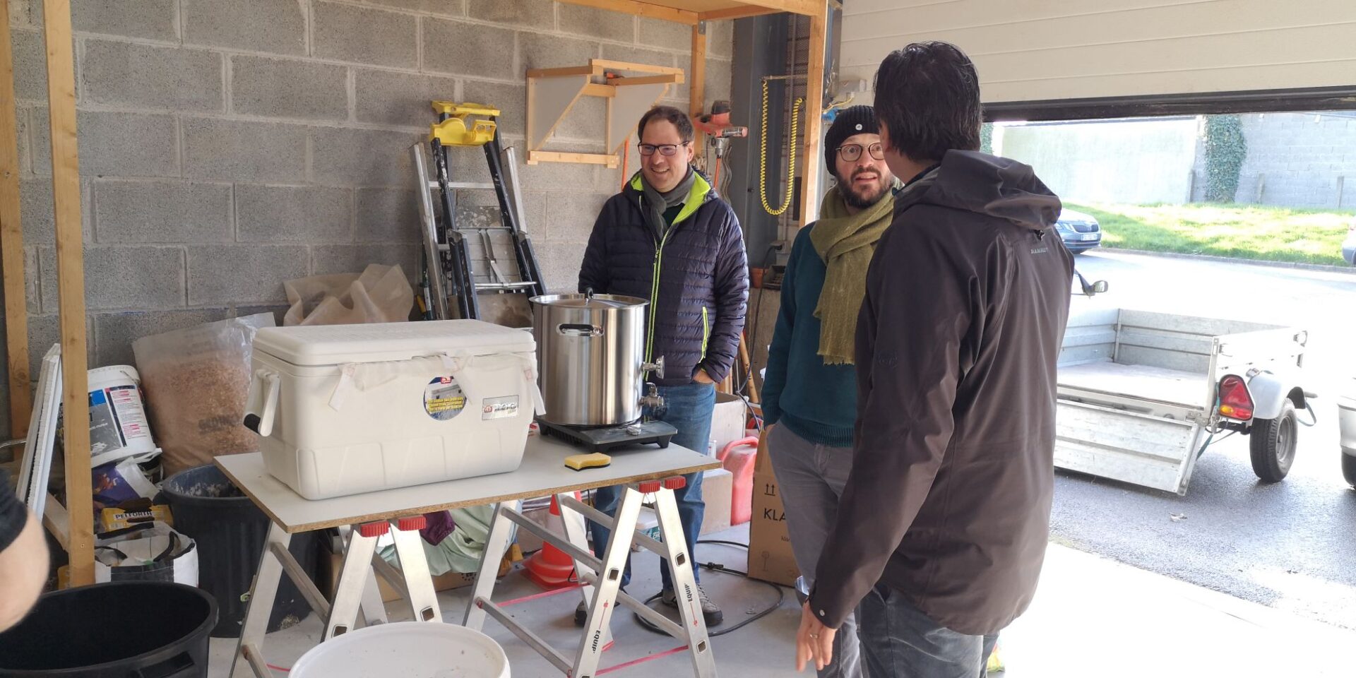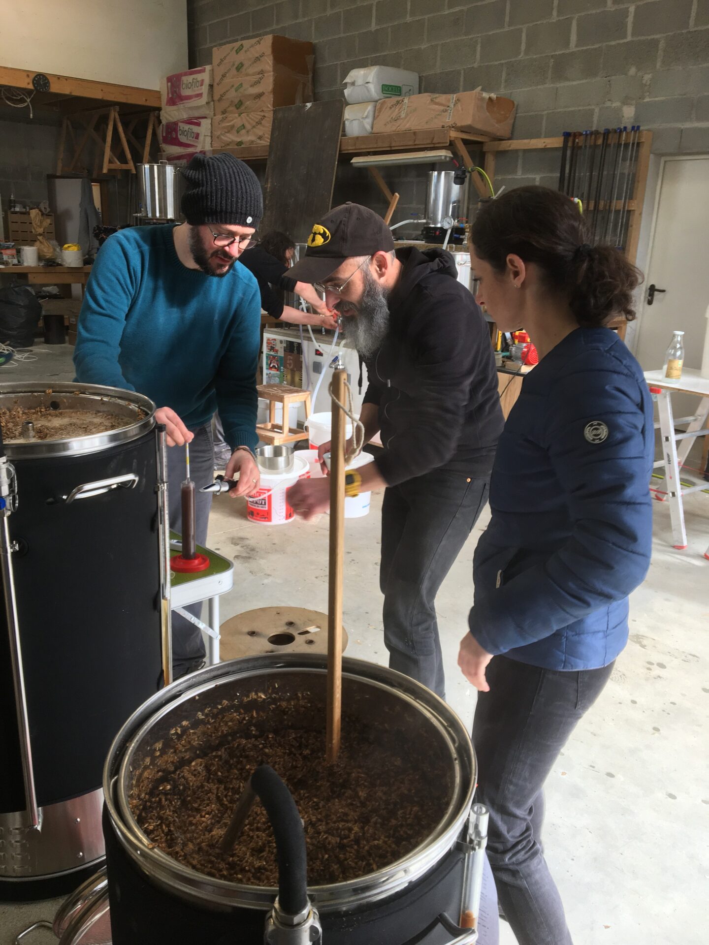 Tôt le matin, Jean-sébastien a mis en route sa pico, rejoint par Ombeline et Pascal ainsi que Samuel et Benoît. Installation du matériel, atelier concassage, mise en chauffe de l’eau ont permis à chacun de lancer l’empâtage de cette bière. Loïc et Jérôme sont venus très vite compléter l’équipe et comme nous avons pu le constater, les équipements étaient très différents, allant de la micro-pico très bricolée en passant par des picos plus élaborés jusqu’à des systèmes tout-en-un type Brewster ou Grainfather.